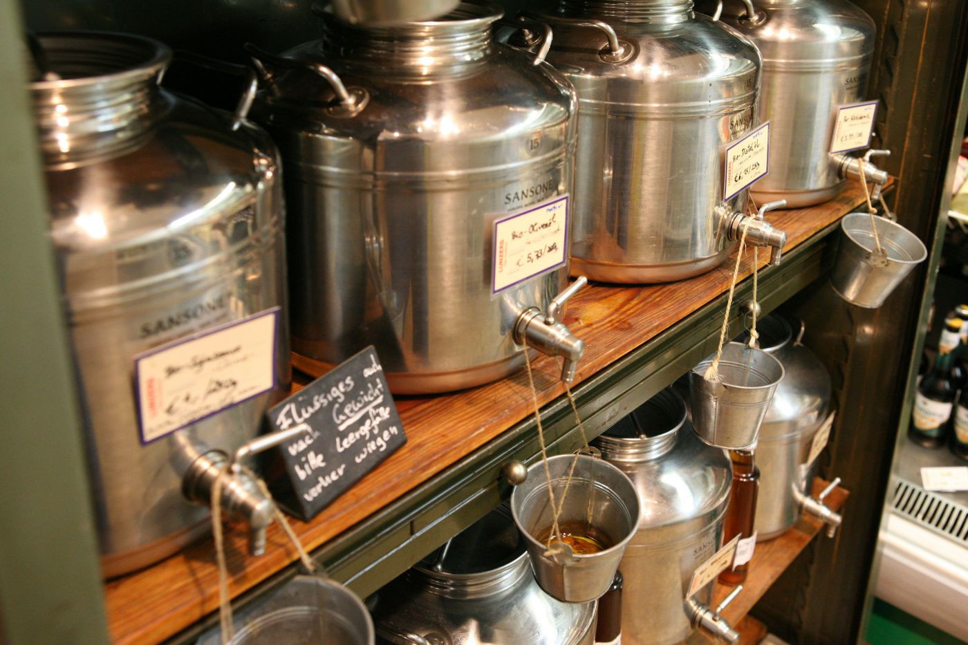 - Eine gute Möglichkeit bieten die Filialen des Franchise-Unternehmens Vom Fass. Wie der Name schon sagt, kann man sich hier alle nur erdenklichen Öl- und Essig-Variationen direkt aus dem Fass abfüllen lassen.